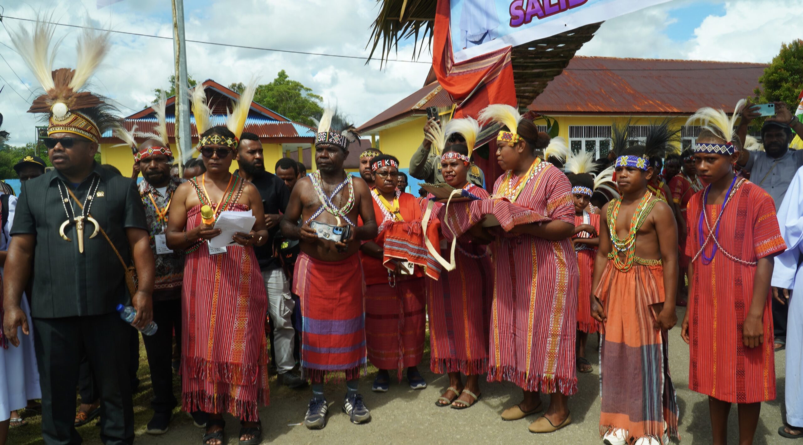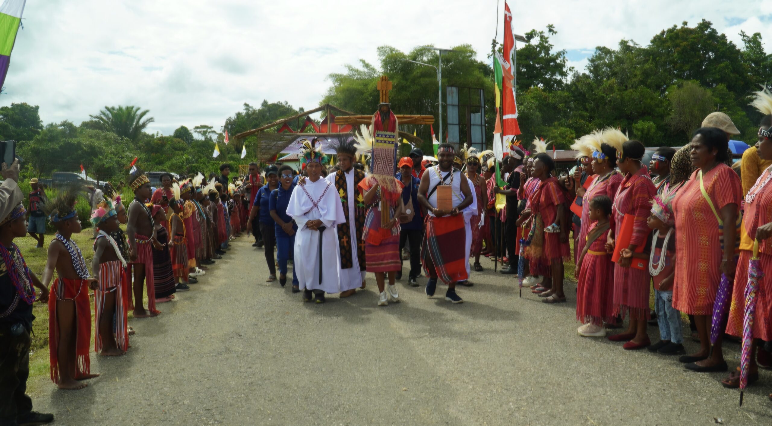 AYAWASI, KOMSOSKMS.ORG – Suasana gegap gempita memenuhi Kampung Ayawasi pada momen bersejarah penyambutan Salib Indonesian Youth Day (IYD) di Paroki St. Yoseph Ayawasi. Sejak pagi hari, masyarakat sudah berkumpul di sepanjang jalan kampung. Nuansa budaya terasa sangat kuat—mulai dari anak-anak, kaum muda, hingga orang dewasa mengenakan pakaian adat Maybrat. Hentakan kaki, tarian adat, dan sorak sukacita menjadi iringan meriah bagi Salib IYD yang diarak masuk ke pusat Paroki.