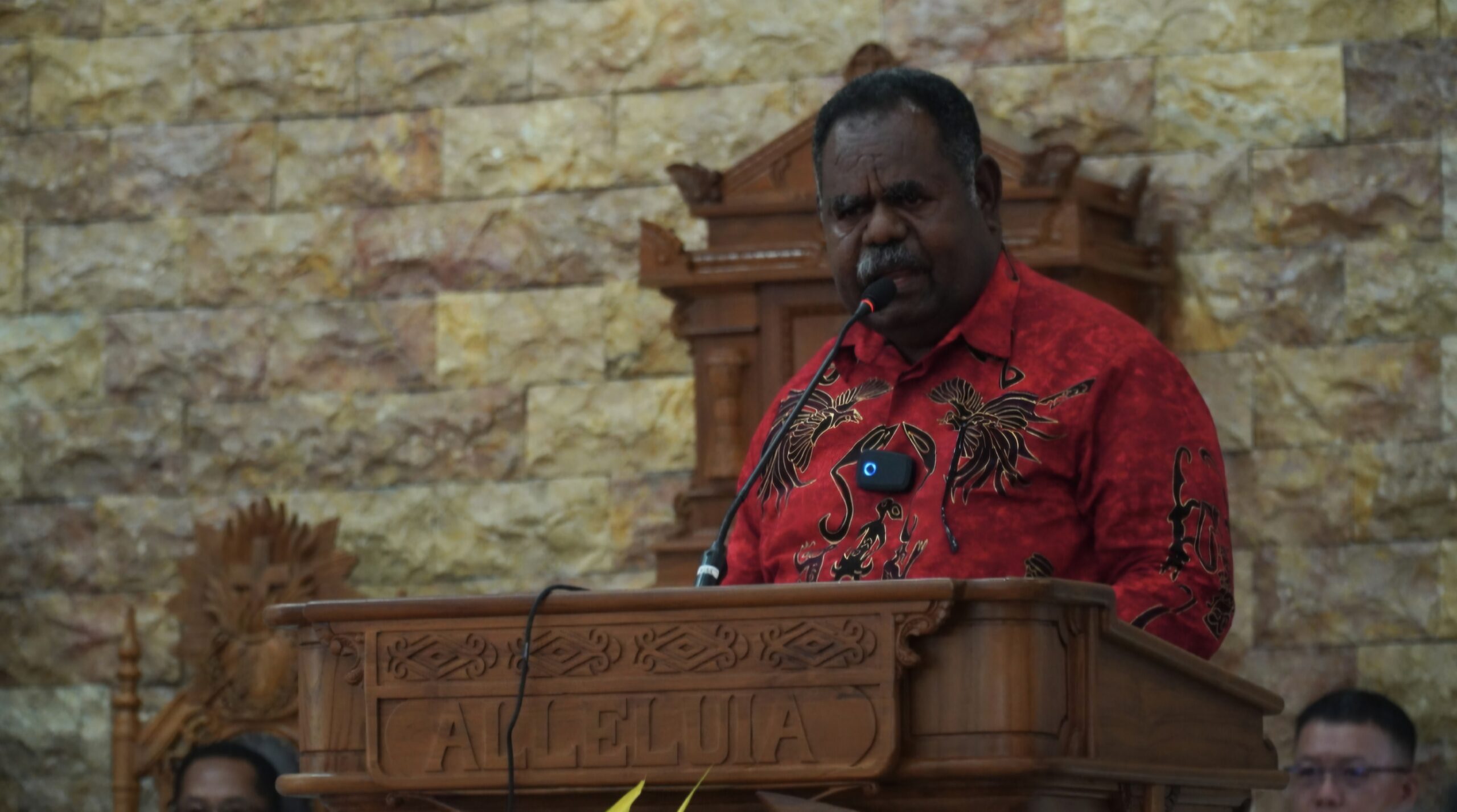 Bupati Kabupaten Maybrat, Karel Murafer, menyampaikan sambutan pada perayaan Pemberkatan Gereja Konja