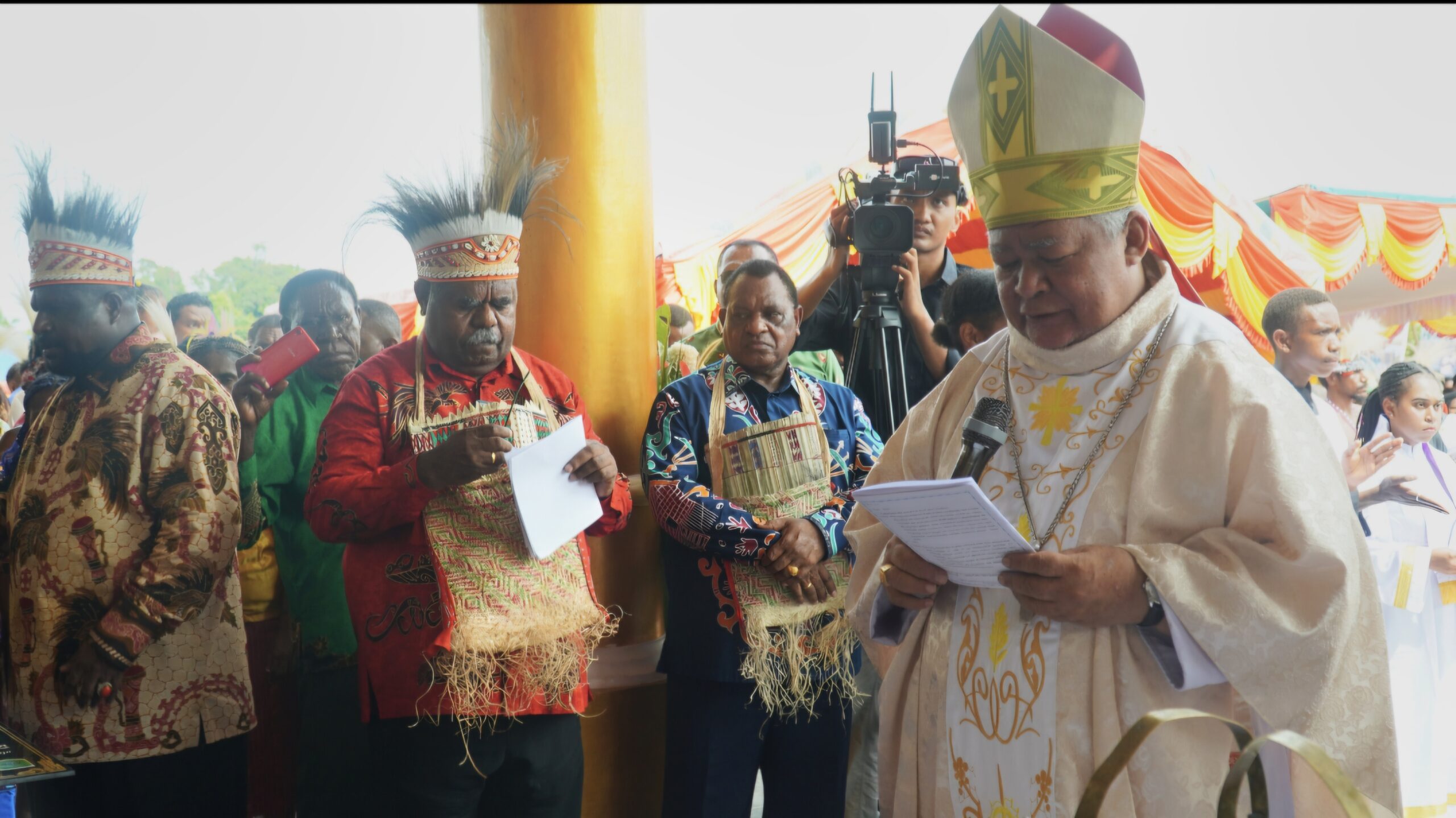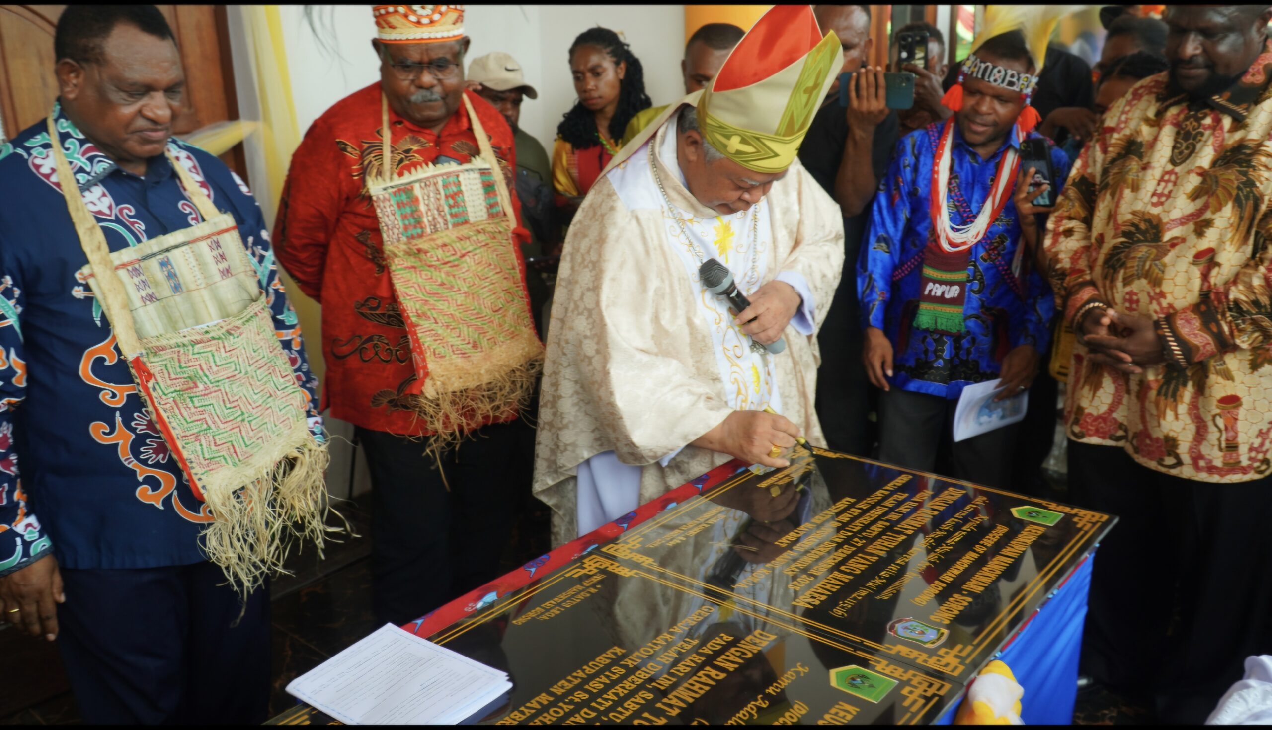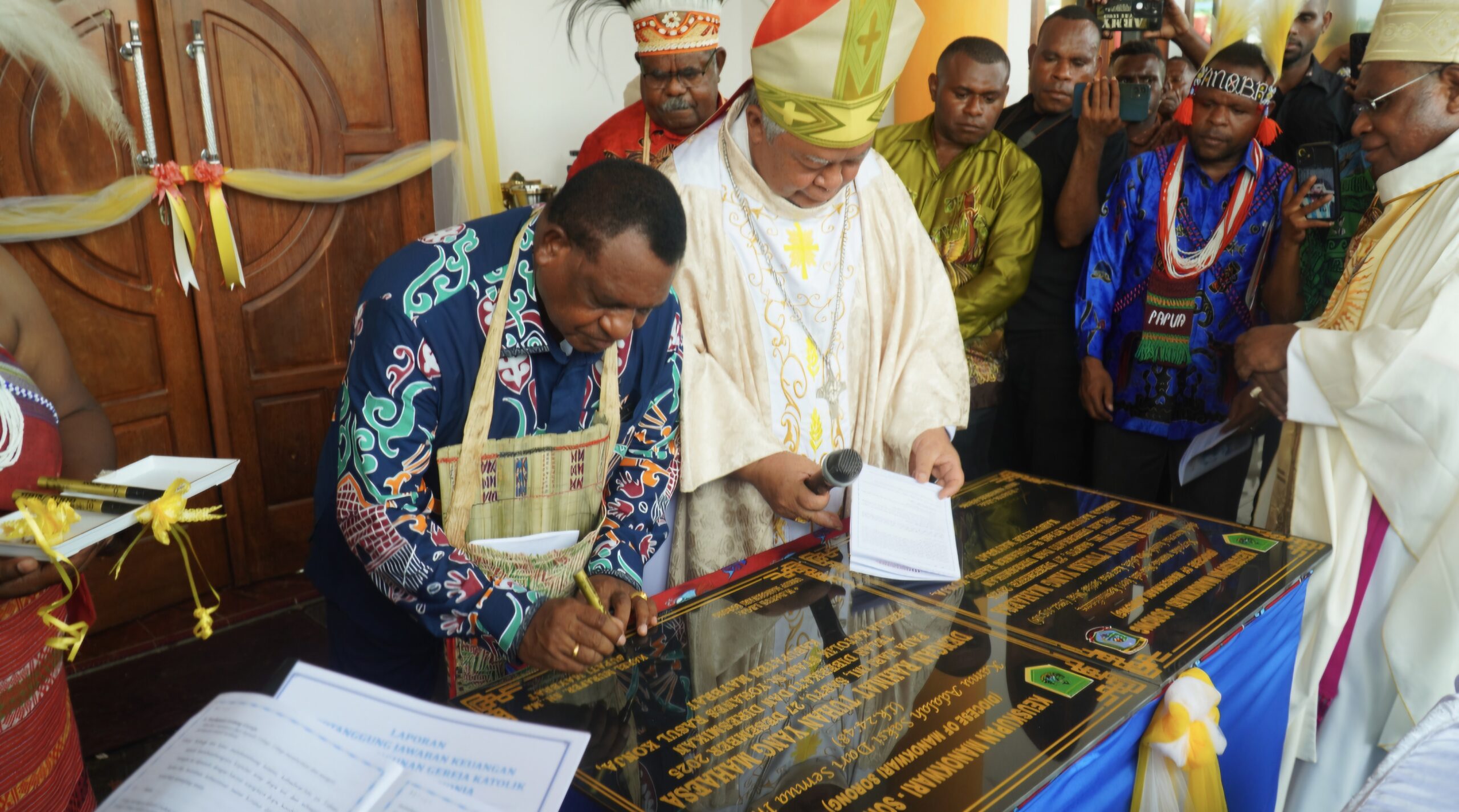 Mgr. Hilarion Datus Lega Menandatangani prasasti pemberkatan Gereja baru Santo Yohanes Rasul Konja