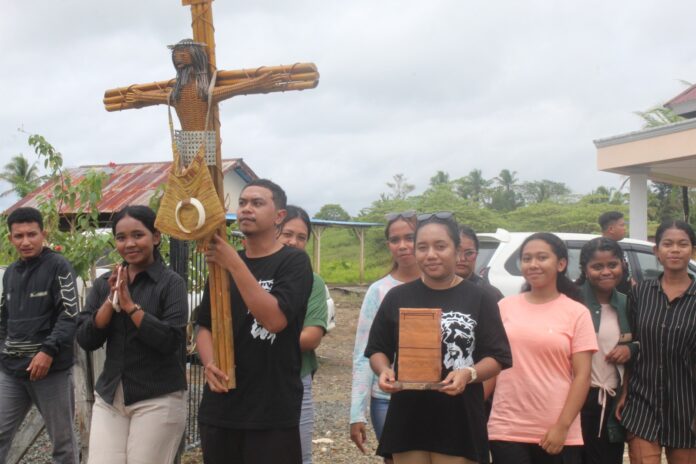 OMK St. Gergius Paroki St. Bernardus mengarak dan menyerahkan Salib IYD 2027 ke OMK Paroki St. Albertus Agung, Teminabuan