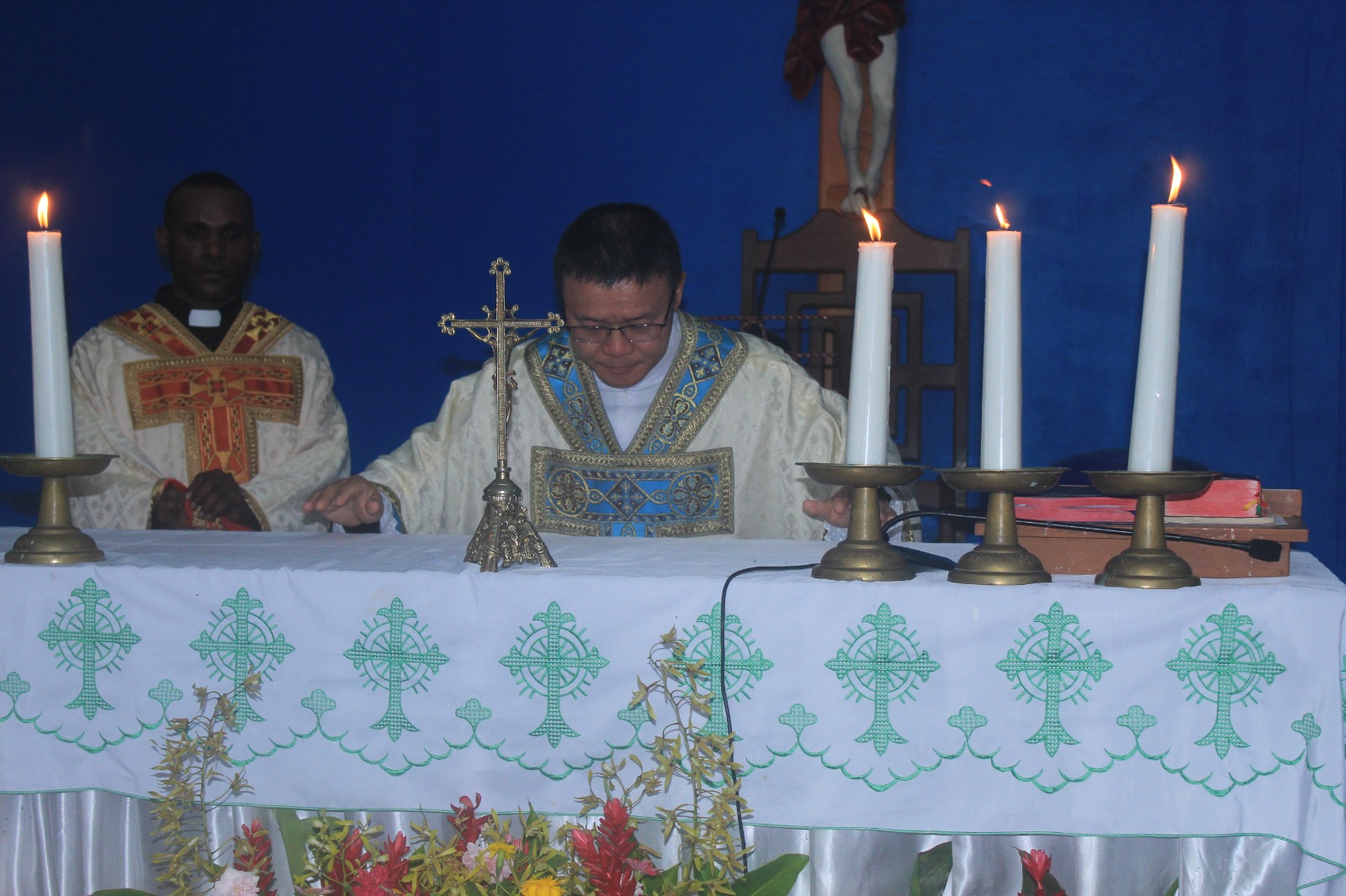 Pastor Paroki St. Albertus Agung, P. Zepto-Triffon Polii, Pr didampingi Ketua Komisi Kepemudaan Keuskupan Manokwari-Sorong, P. Iventus Kocu, Pr memimpin perayaan Ekaristi menyambut Salib IYD di Teminabuan
