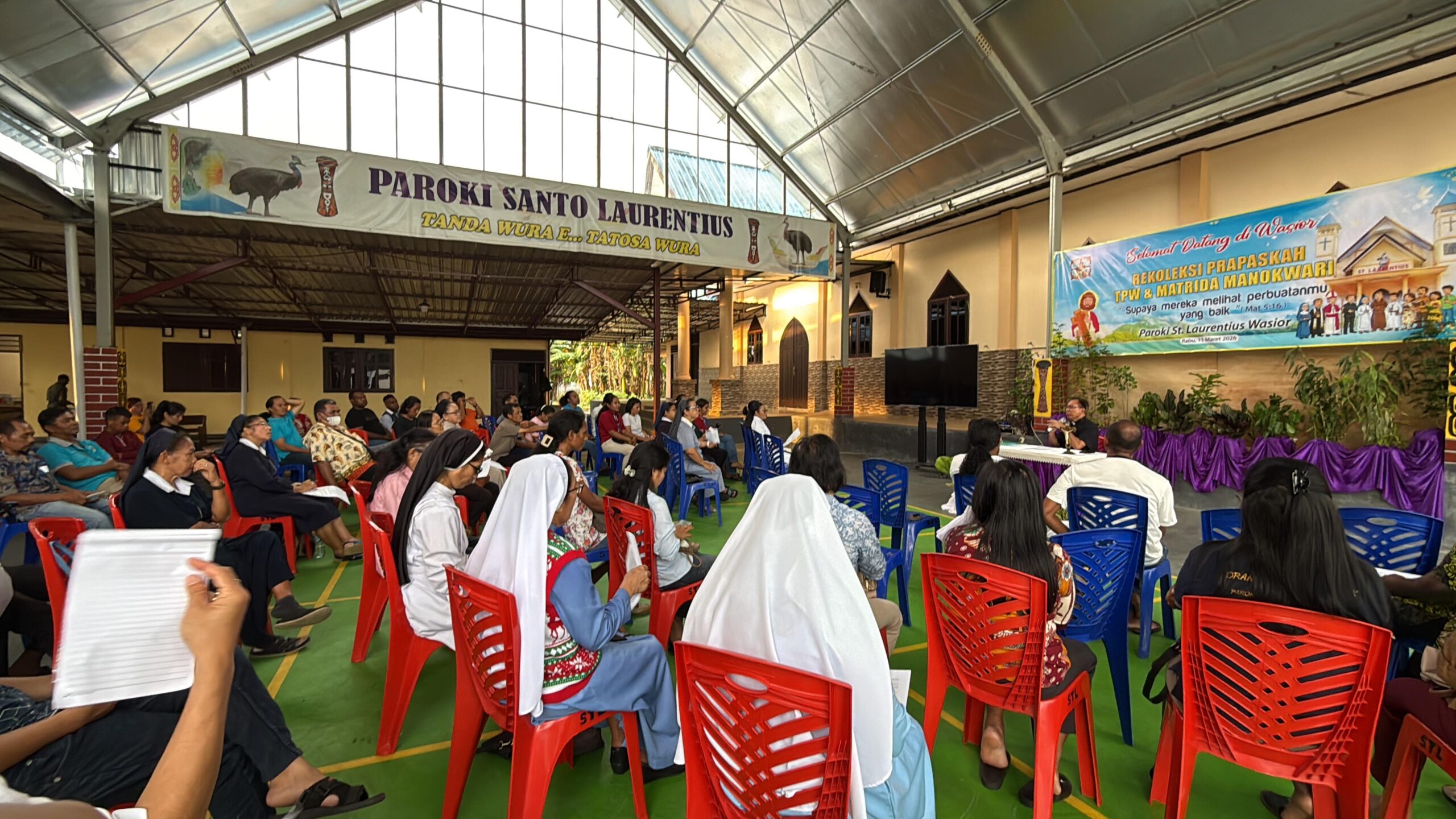 WASIOR, KOMSOSKMS.ORG- Masa Prapaskah adalah masa Retret Agung untuk seluruh warga Gereja tanpa terkecuali. Demikian pula dihayati oleh para imam, suster, bruder, dan frater di TPW Manokwari. Selain bertekun dalam pelayanan-pelayanan, mereka saling menimba kekuatan dalam kolegialitas persekutuan karya misi dengan berkumpul bersama dalam rekoleksi TPW Manokwari di Paroki St Laurentius Wasior Rabu 11 – Kamis 12 Maret 2026. Tema yang direnungkan dalam rekoleksi selaras dengan Tema Surat Gembala Prapaskah, “Supaya Mereka Melihat Perbuatanmu yang Baik – Mat 5:16)”. Pemberi renungan kali ini adalah Rm Thomas Suparno CM, Pastor Paroki St Thomas Aquinas Amban.