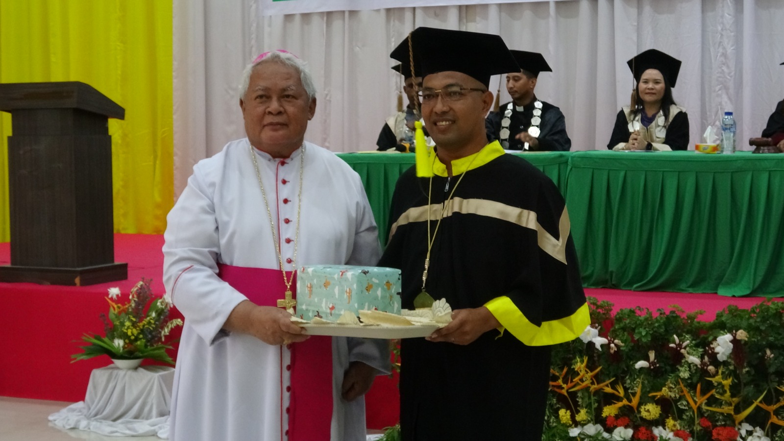 “Prestasi hari ini bukan hasil yang mudah. Kita menyaksikan lulusan-lulusan terbaik yang oleh kasih Tuhan sampai pada gelar sarjana. Pendidikan tidak berhenti pada gelar, tetapi terus berproses dalam kehidupan kita sehari-hari,” katanya.